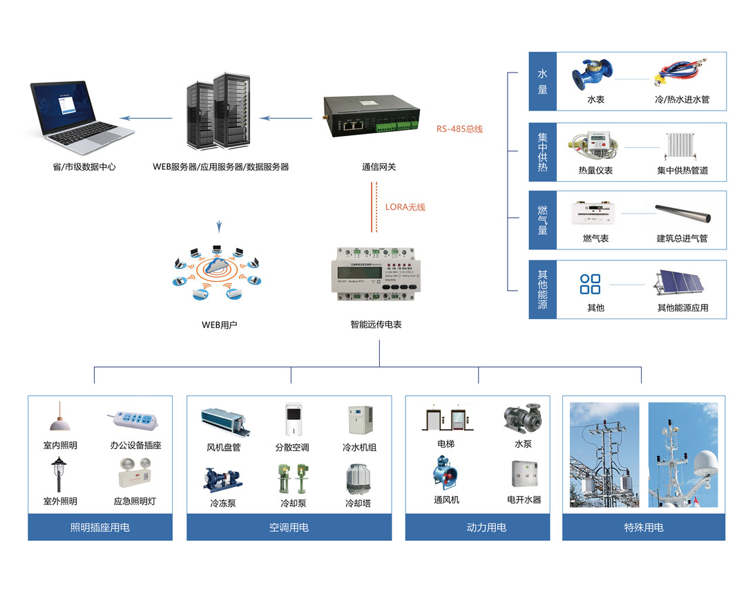 能耗監(jiān)測(cè)系統(tǒng)通過對(duì)電表、水表、熱量表、燃?xì)獗淼扔?jì)量表數(shù)據(jù)的在線監(jiān)測(cè)、采集、傳輸、報(bào)警、建模和運(yùn)算,實(shí)現(xiàn)分類(水、電、暖、氣)、分項(xiàng)(空調(diào)、照明插座、動(dòng)力、特殊用電)和分區(qū)(樓宇、樓層、部門、房間)綜合能源使用管理。深挖能源管理數(shù)字化轉(zhuǎn)型痛點(diǎn),解決用能單位能耗數(shù)據(jù)可視性差、數(shù)據(jù)孤島難打破、巡檢方式落后、缺乏統(tǒng)一調(diào)度等難點(diǎn)。