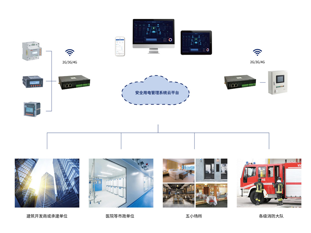 安全用電管理系統(tǒng)基于移動(dòng)互聯(lián)網(wǎng)、云計(jì)算技術(shù)、通過物聯(lián)網(wǎng)傳感終端,將辦公建筑、學(xué)校、醫(yī)院、賓館、體育場(chǎng)館、生產(chǎn)企業(yè)等人員密集場(chǎng)所的電氣安全數(shù)據(jù),實(shí)時(shí)傳輸至安全用電管理云服務(wù)器,提供不間斷的數(shù)據(jù)跟蹤、統(tǒng)計(jì)分析和安全監(jiān)管,將各種安全隱患信息及告警信號(hào),并推送給企業(yè)有關(guān)人員,以便及時(shí)檢查和消除隱患,真正做到防患于未然。
